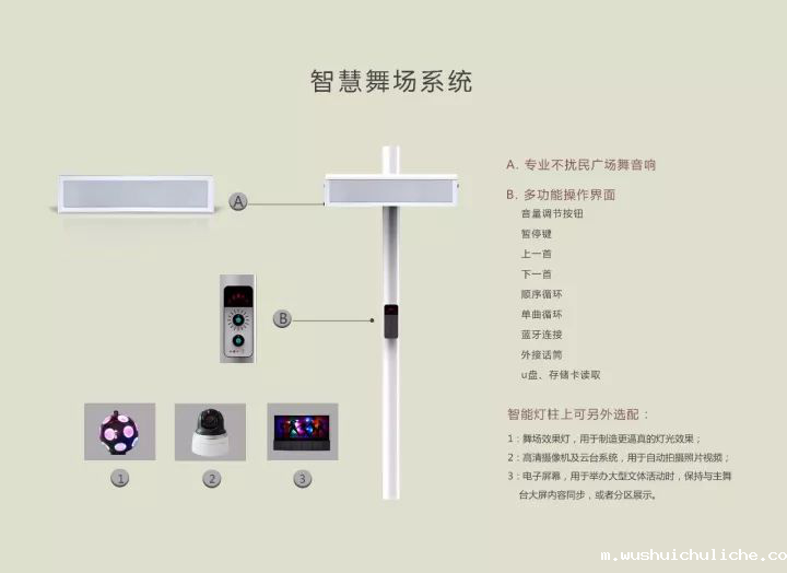 智慧舞场系统主要由伟德竞彩网App专业不扰民广场舞音响和多功能操作界面组成,可根据环境需求选配智能灯柱(包括效果灯、高清摄像机、电子屏幕)加强舞蹈学习、营造舞美效果、拍摄比赛视频等。