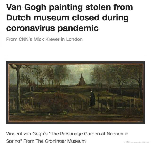 据美联社、英国每日快报等多家媒体报道,3月30日凌晨,位于荷兰阿姆斯特丹东部的辛格·拉伦博物馆夜间遭盗贼闯入,正在展出的梵高画作《春天花园》被盗。据悉,这件作品是该馆从荷兰北部城市格罗宁根的格罗宁格博物馆借展的。作品创作于1884年,画的是荷兰小镇纽南的乡村风景。据一位艺术家透露,这副画作的价值可能高达600万欧元。